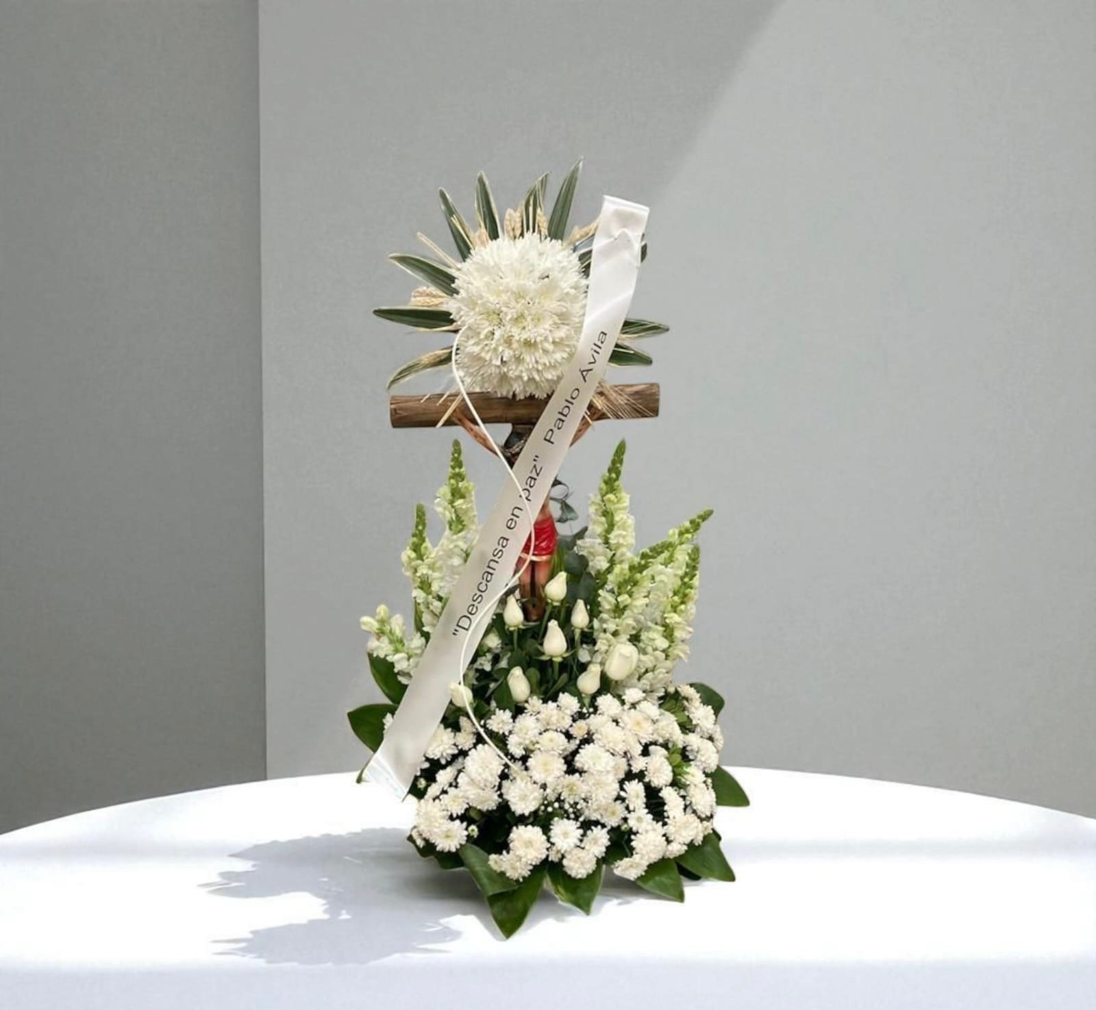 Arreglo fúnebre con cruz de madera y flores blancas que simbolizan fe, paz y descanso eterno. Incluye listón personalizado para dedicatoria y entrega el mismo día.