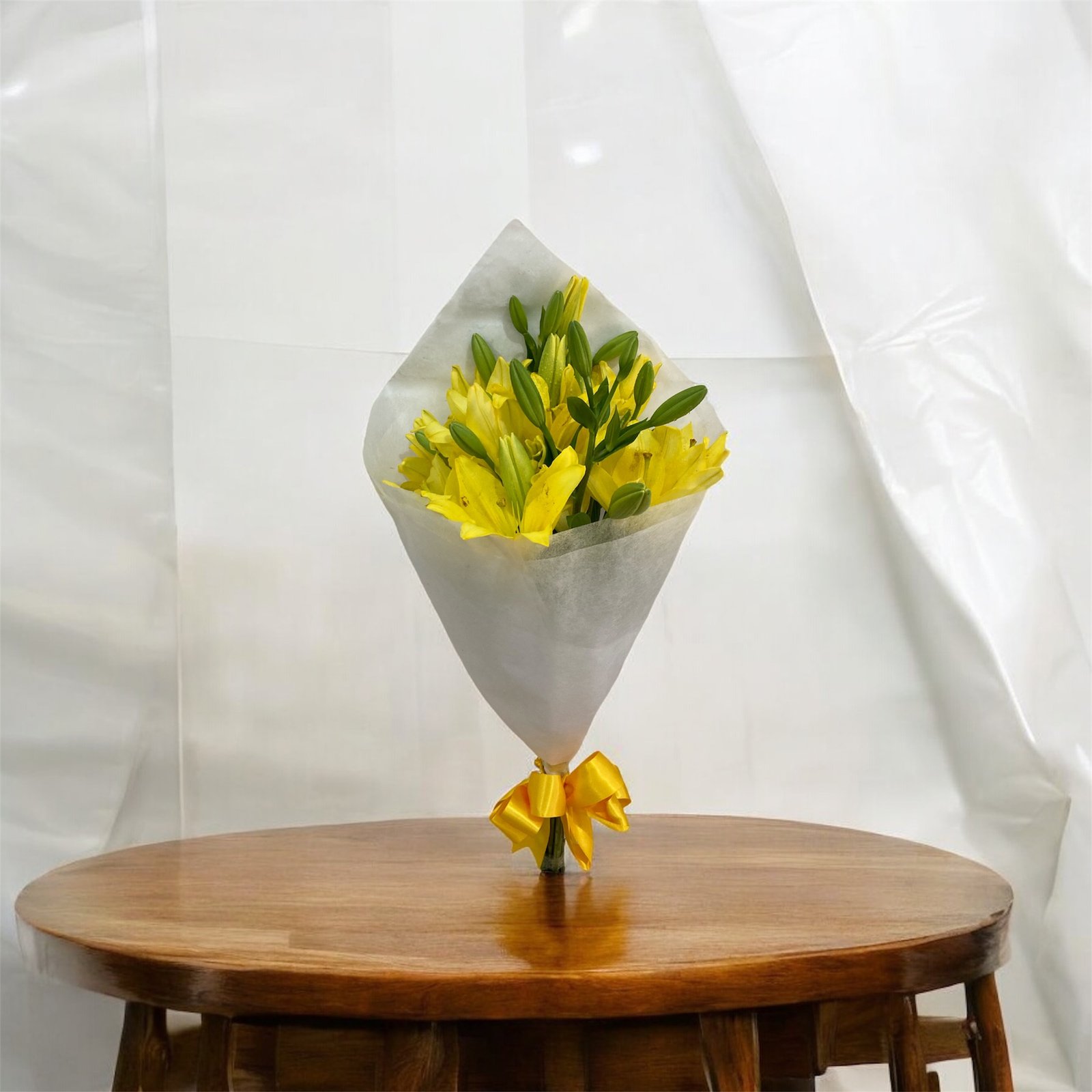 Brillo Amarillo es un ramo floral elegante compuesto por 5 tallos de lirios amarillos frescos acompañados de brotes naturales y follaje verde que aportan frescura y volumen al diseño. Su presentación minimalista envuelta en papel color blanco resalta la intensidad del color amarillo, creando un detalle moderno y sofisticado.