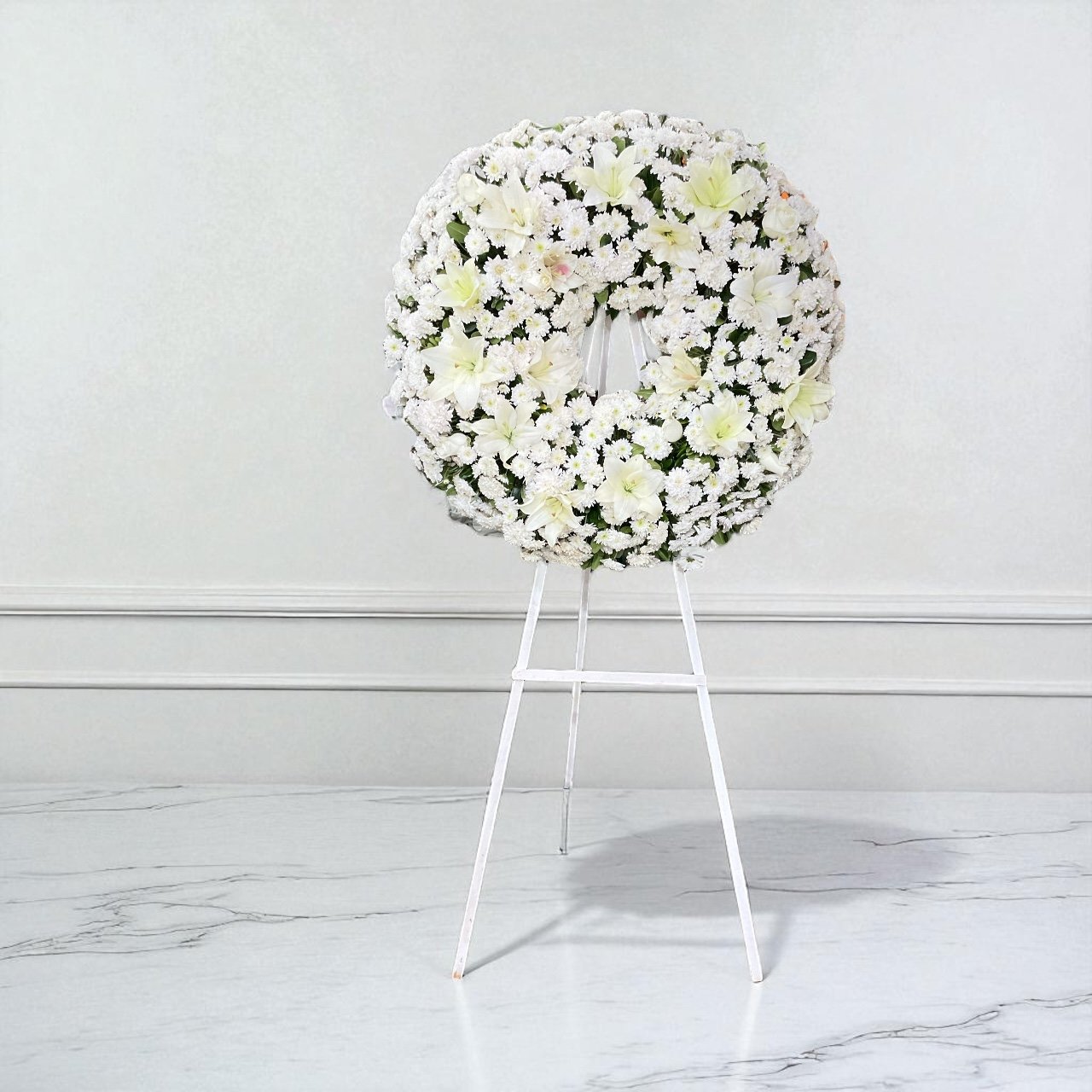 Esta corona está elaborada con una delicada composición de flores blancos, flores blancas y lirios, creando un diseño armonioso que simboliza pureza, paz y descanso eterno. El color blanco es tradicionalmente asociado con la serenidad, la luz y el recuerdo eterno de quienes han partido.
