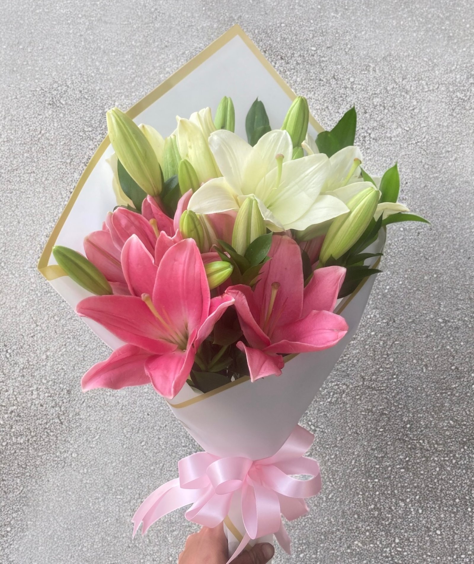 Dulce Elegancia es un ramo floral sofisticado compuesto por 5 lirios rosados y 5 blancos frescos acompañados de delicados brotes que aportan volumen y frescura al diseño. Su combinación de colores suaves transmite ternura, elegancia y armonía, convirtiéndolo en un detalle ideal para momentos especiales.