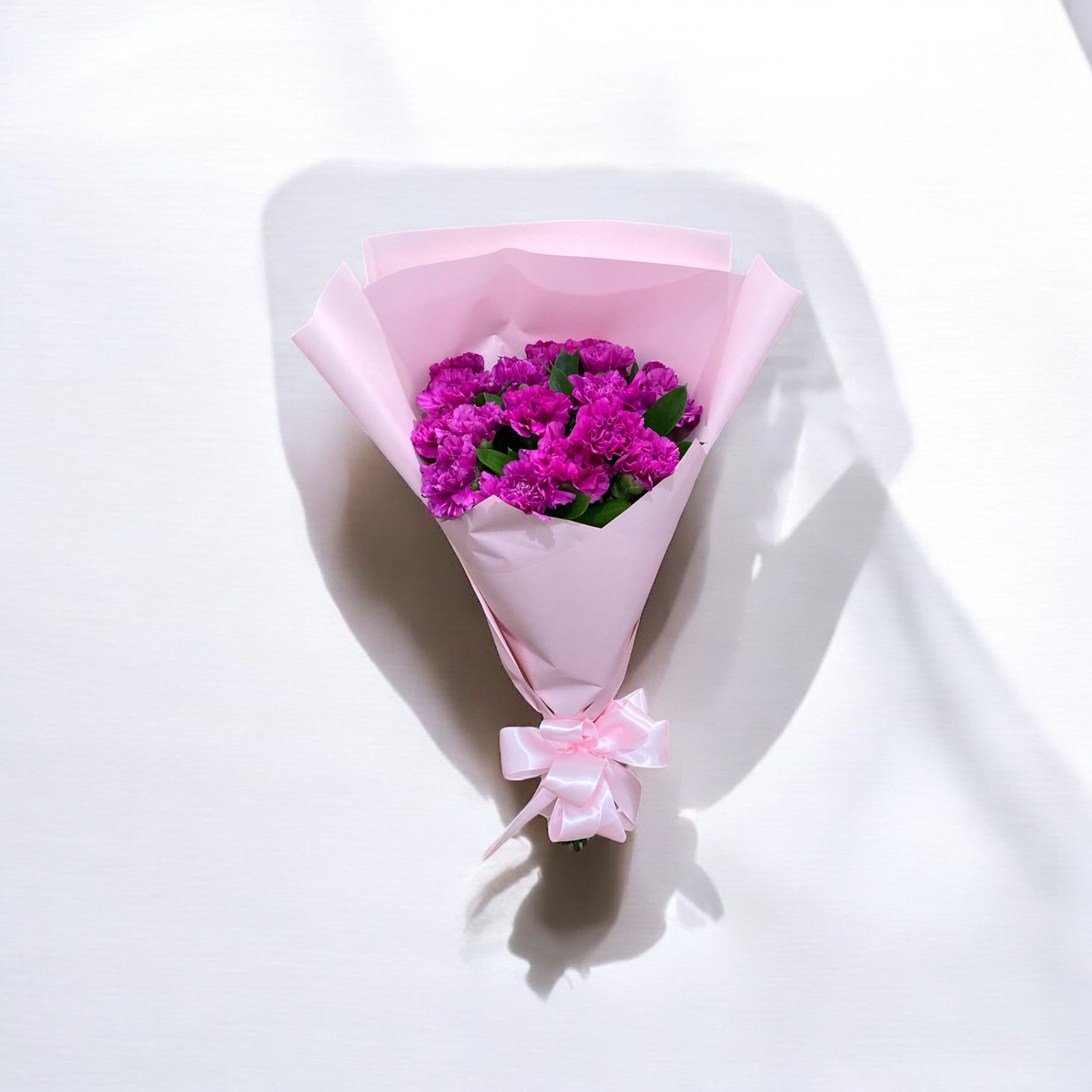 Ramo de claveles fucsia frescos envuelto en papel rosado con moño satinado. Un detalle elegante y lleno de color ideal para regalar en cualquier ocasión especial.