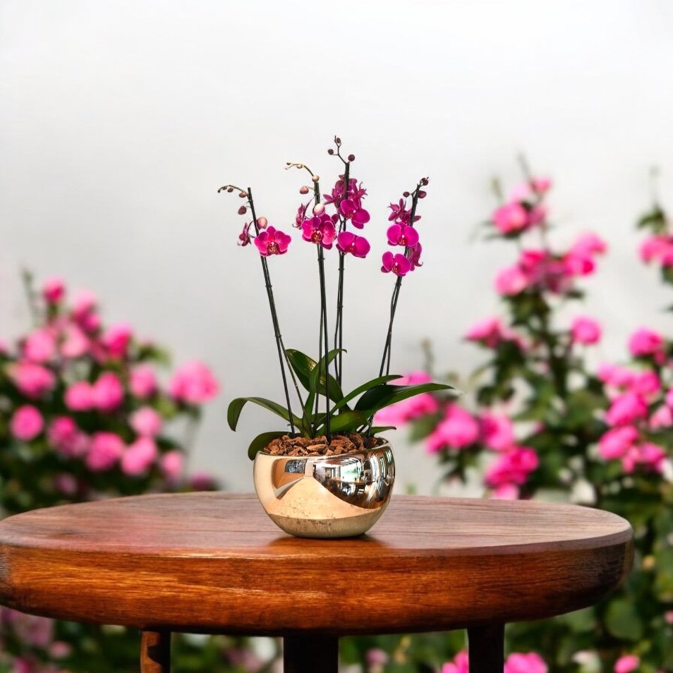 Orquídea Pink Luxury es un elegante arreglo de 2 plantas de orquídea Phalaenopsis en vibrantes tonos rosados presentado en una sofisticada base dorada de diseño contemporáneo. Su combinación de flores delicadas y maceta decorativa crea una pieza exclusiva que aporta elegancia, estilo y distinción a cualquier espacio.