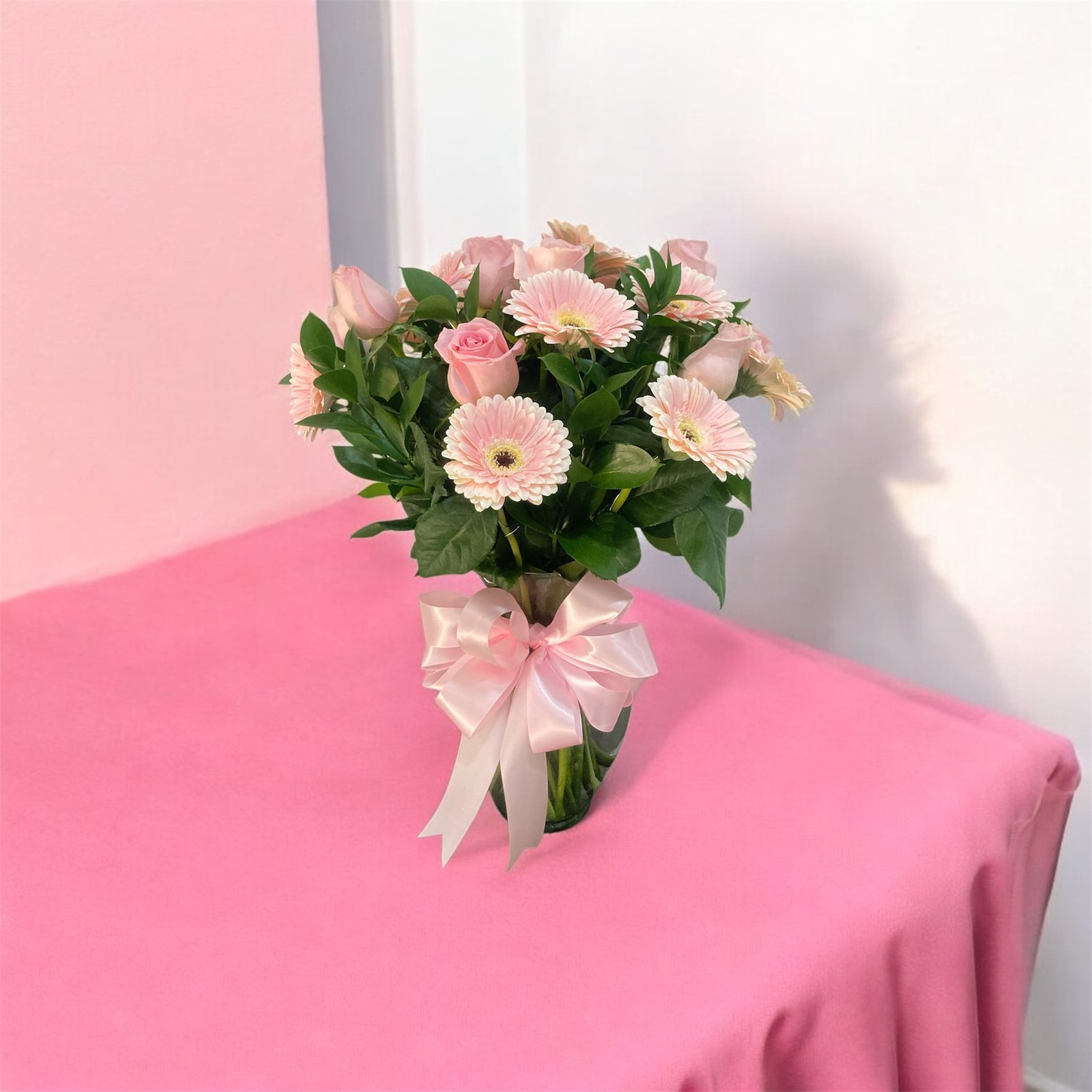 Sueño Rosa es un delicado arreglo floral que combina 10 gerberas en tonos rosados con 12 elegantes rosas pastel y follaje verde natural. Su diseño equilibrado y suave transmite ternura, frescura y elegancia, convirtiéndolo en una opción ideal para sorprender a alguien especial.