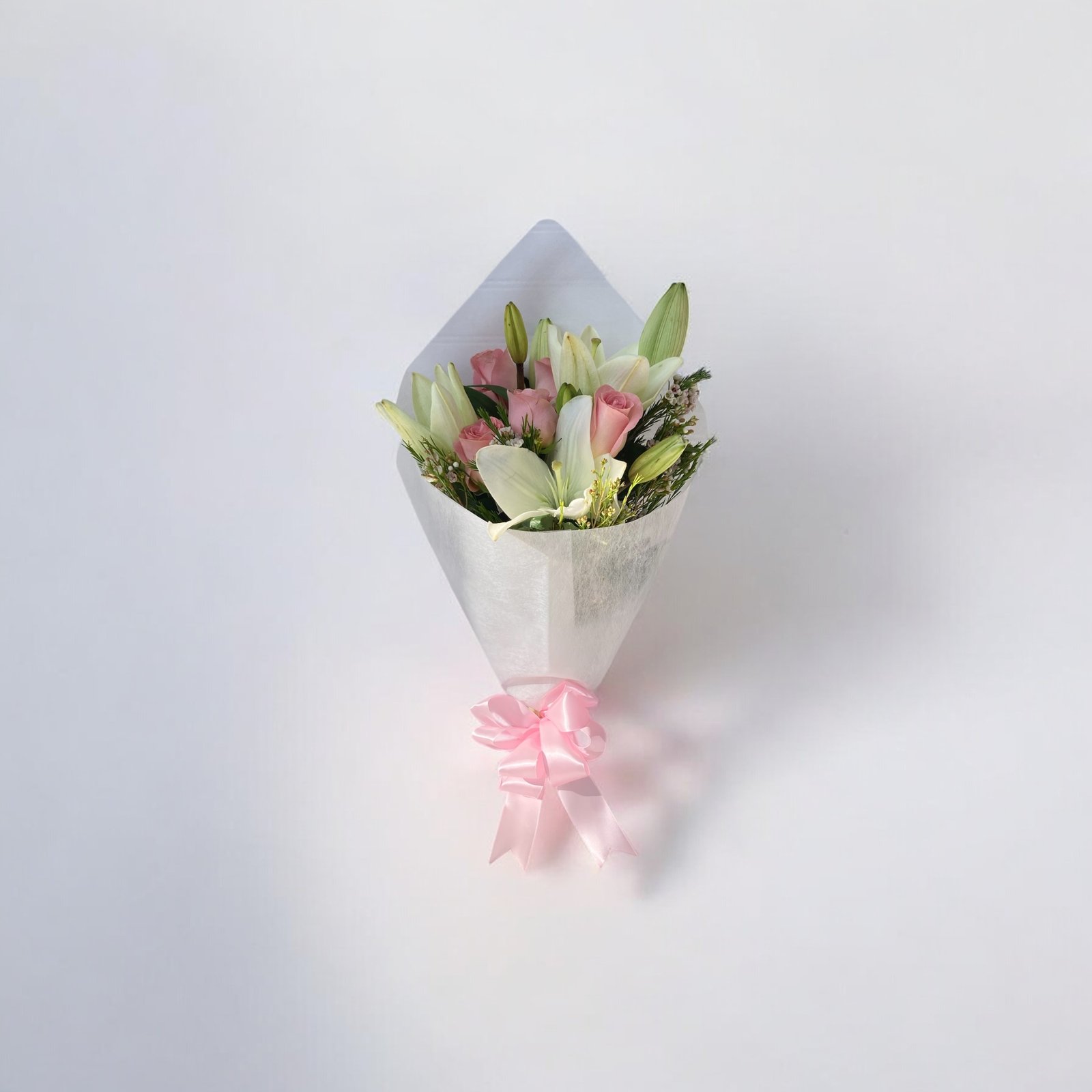Suspiro de Amor es un ramo floral elegante que combina 3 lirios blancos frescos con 6 delicadas rosas rosadas, creando una composición armoniosa llena de suavidad y elegancia. Su mezcla de tonos claros transmite ternura, admiración y buenos deseos, convirtiéndolo en un detalle perfecto para expresar sentimientos sinceros.